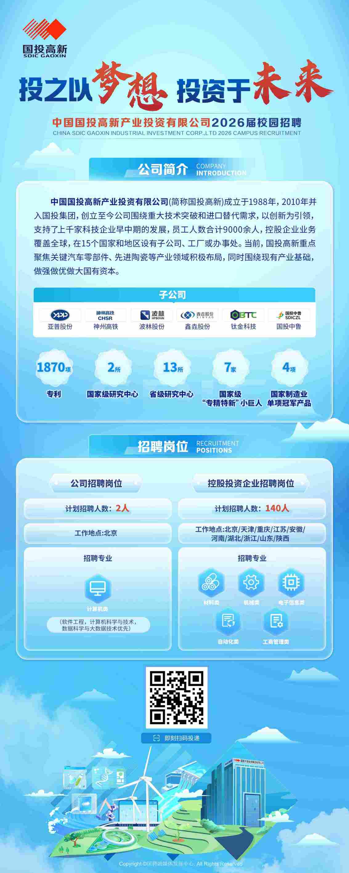 中国国投高新产业投资有限公司2026届校园招聘火热进行中!<br />央企实力+市场化机制+产业深耕,国投高新成立以来,始终围绕重大技术突破和进口替代需求,以创新为引领,支持了上千家科技企业早中期的发展。重点围绕先进制造、新材料等核心赛道积极布局,是国投集团服务国家创新发展、助力国家产业链安全的投资运营管理平台和科技创新产业孵化平台。<br />热招岗位: